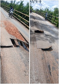 Saat awak media meninjau kelokasi,bahwa kondisi Jembatan yaitu sebagian lantainya perlu diperbaiki,sebab kondisi sudah membahayakan,pengguna jalan.