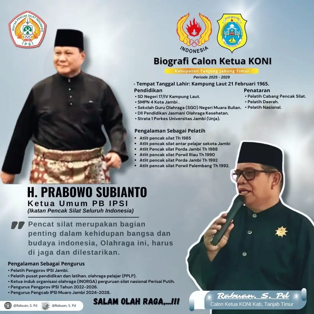 Dalam dinamika pencalonan, muncul nama Rabuan Sinaga, S.Pd., yang dinilai memiliki rekam jejak mumpuni di dunia olahraga. Arie Suryanto, seorang penggiat sosial di Tanjabtim, mengungkapkan bahwa Rabuan memiliki latar belakang pendidikan, pengalaman sebagai atlet, serta kiprah sebagai pembina dan pengurus olahraga yang menjadikannya sosok yang layak untuk memimpin KONI Tanjabtim.“Pergantian kepemimpinan di KONI harus mampu membawa terobosan dalam pembinaan cabang olahraga agar dapat meraih prestasi yang lebih tinggi, baik di tingkat regional, nasional, maupun internasional. Rabuan adalah sosok yang memiliki pengalaman dan dedikasi yang kuat dalam dunia olahraga, terutama di cabang Pencak Silat,” ujar Arie Suryanto kepada media ini, Senin 10 Maret 2025.