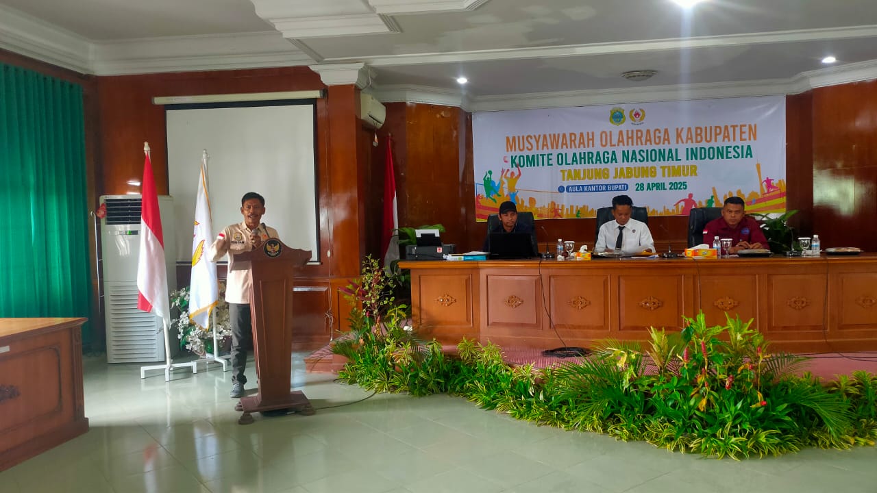 Tanjung Jabung Timur, RJC – Komite Olahraga Nasional Indonesia (KONI) Kabupaten Tanjabtim menggelar Musyawarah Olahraga Kabupaten (Musorkab) tahun 2025, di Aula Kantor Bupati Tanjabtim, Senin (28/4/2025) siang.